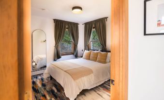 One queen bed with a memory foam mattress, a private closet with two full-length mirrors, nightstand lights and an overhead light, and a portable tower fan.