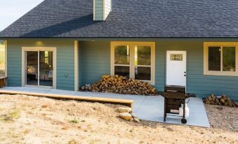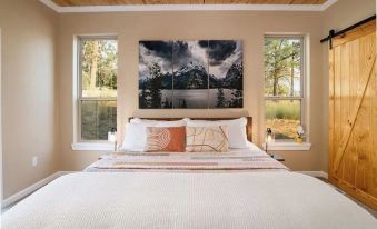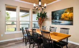 Completed in 2022, this modern 3 BR/2 BA cabin has a split master floor plan with a large open common area and all the amenities to relax and make lifelong memories. Highlights include the wood burning stove set into a custom river rock and stone fireplace, an 8' long live edge white oak dining table handmade by your host, tongue and groove pine natural finish ceilings, and stunning images of the surrounding landscape by local photographers.