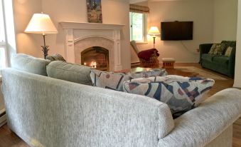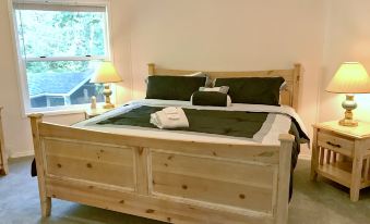 This custom octagonal 3-story, 2+ bedroom, 2-bath home perched on top of a knoll is an architectural gem, with lots of light and all of the bells and whistles! The ground floor entryway features ceramic tile floors with a freestanding gas fireplace and an ad-hoc game room, complete with a ping pong table and plenty of space to store your gear—winter and summer. Ascending the stairwell brings you to the main floor, featuring the master bedroom with 1 king sized bed and a large full-length closet. Step into the generous living room/dining room area with hardwood floors, a beautiful gas fireplace to cozy up to, a large screen monitor with wifi, a Hide-a-bed, and 3 sides of windows that bring in lots of natural sunlight—perfect for family entertaining. The unique, fully equipped galley style kitchen features ceramic tile floors and countertops, a separate stove top and oven, as well as a built-in microwave oven. Also included in the kitchen is a laundry cubby with a full size washer and dryer. Finally, the main floor also includes one large full bath. Step up to the third floor and you’ll discover a carpeted bonus room/loft with a queen-sized futon and a Dvd/vhs/monitor—perfect for the kids—a large bath, and a unique pine-lined bedroom with 1 queen-sized bed. Just outside the main floor living room is a partial wraparound deck for winding down the day while gazing at the stars, and just out back is a private 6-person outdoor hot tub—perfect for relaxing after a day of some of the best skiing and hiking anywhere! This beautiful and pet friendly family vacation property will sleep 4 to 8 persons (enforced Maximum Occupancy).