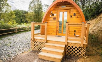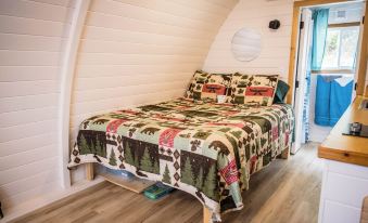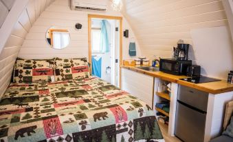 This one-of-a-kind arched glamping pod offers a cozy retreat with modern comforts. Inside, you'll find a queen bed, futon couch, and a kitchenette equipped with a coffee maker, microwave, toaster, and cooktop. The cabin also has a full bathroom with a shower and toilet for your convenience.