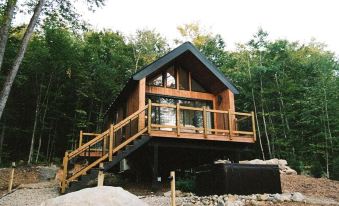 Exterior: Nestled in a tranquil woodland, this Scandinavian cabin is an eco-conscious haven built into the hillside using innovative architectural practices to minimize land disturbance. The natural wood facade seamlessly blends with the forest, and the gently sloping roof integrates the cabin into the landscape. Floor-to-ceiling windows offer stunning views of the surrounding greenery and flood the interior with natural light. Each cabin is private and secluded, ensuring a peaceful retreat.