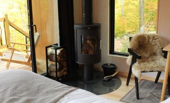 Interior: The cabin’s interior exudes minimalist elegance and warmth, with an open-plan living area centered around a cozy wood-burning stove. The second floor loft offers additional space for rest and relaxation while inviting views of the night sky through the skylight. The decor features locally sourced woods like pine and birch, clean lines, and natural textiles including waffle knit throws, linen cushions, and sheepskin rugs.