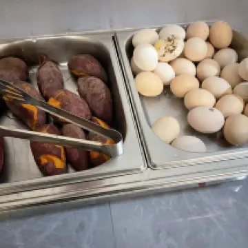 Món cháo trứng và thịt nạc bảo quản cho bữa sáng rất ngon, nhưng món trứng luộc chín rõ ràng là dở nên tôi lấy một cái trông có vẻ ngon nhưng khi bóc ra thì hóa ra lại dở. và có mùi hôi.