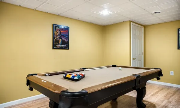 The basement includes a movie room with a sleeper sofa, pool table, and dart board.