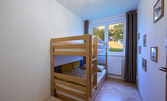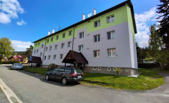 Apartment block "Harrachov 377". 800 m from the centre of Harrachov, in a quiet, sunny position. In the house: central heating system. Parking at the house. Supermarket 500 m, restaurant, café 200 m, bus stop "Sklárna" 300 m, railway station "Harrachov" 3 km. Minigolf 1.5 km, ski rental 200 m, ski bus stop 200 m, ski school 1.5 km, cross country ski track 1 km. Nearby attractions: Mumlavské vodopády 3 km, Šindelka 2.5 km, Ski muzeum 2.5 km, Sklárna Novosd a syn a pivovar 200 m, muzeum skla 200 m, bobová dráha 300 m. Well-known ski regions can easily be reached: Harrachov 2 km, Rokytnice n/J 17 km, Paseky n/J 13 km. Hiking paths: Vosecká bouda 12 km, Dvoračky 10 km, Labská bouda 15 km. "Cozy Family Getaway", 3-room apartment 65 m2. Renovated in 2022, modern furnishings: 1 room with 1 double bed (160 cm, length 200 cm). 1 room with 1 x 1 bunk beds, 1 pull-out bed. Living room with 1 sofabed and TV. Exit to the balcony. Kitchen (oven, dishwasher, 4 induction hot plates, kettle, freezer, electric coffee machine, Capsules for coffee machine (Dolce Gusto) extra). Shower, sep. WC. Facilities: washing machine, children's high chair. Internet (WiFi). Please note: suitable for families. Non-smokers only. Harrachov card free.