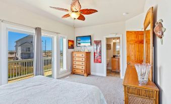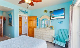 The first floor game room offers a pool table, poker table, chess/checker table, wet bar/kitchenette, full size refrigerator with ice maker and microwave. When you need a break from the sun, enjoy the adjacent private 3D home theater room with an 80’ Smart Flatscreen TV with Cinema surround sound and a 3D Blu-Ray player. We provide several 3D movies for your enjoyment, along with a supply of 3D glasses. Two bedrooms, one queen and the other with two sets of bunk beds, double bottom bunk and top twin bunk and a Jack-n-Jill bathroom. (Perfect room for a family with kids.) The queen bedroom is also handicap accessible.