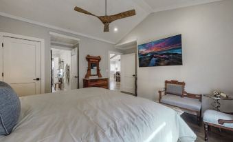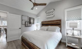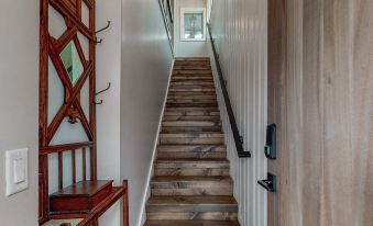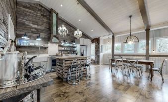 You will be greeted by an open concept floor plan with vaulted ceilings in the kitchen, dining and living areas. The kitchen features quartz countertops, high end appliances, custom cabinetry including a wine cooler and a hand-built island with a butcher block top and seating for four. The dining area has a table with ample room for six. The living area has plenty of space to relax while reading a book or enjoying the game on the 65” television. The electric fireplace gives just the right touch of ambiance for a cool evening. The top-of-the-line sleeper sofa with air chamber and plush mattress give you space for two additional guests. And kids are always welcome at The Fifth; they even have their own loft space set up as a play area!