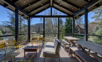 The best spot in Highlands! Only one block from Main Street and the Old Edwards Inn, this five bedroom house has a unique mix of modern and mountain and is wonderful for large groups or multiple families. Floor to ceiling windows and a huge back porch look over Harris Lake and Satulah Mountain. On the ground floor there are two suites separated by a living room. Each suite has two bedrooms and a full bathroom. Upstairs there's a large great room perfect for gathering. A fireplace, dining table for ten, modern kitchen, powder room, master suite with dual vanities, freestanding tub and shower and a massive covered deck round out the second floor. Two laundry rooms, WIFI. 65in HD tv. Off-street parking for six cars. This mountain retreat is just waiting for you!About pets:No pets allowed.About checkOut:Check out before 10:00 AM.About children:Children allowed: ages 0-17.Please note this house is Lakeside.About checkIn:Check in after 4:00 PM.About smoking:Smoking is not permitted.About minBookingAge:Minimum age to rent: 25.About events:No events allowed.