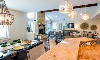 The large sectional makes family movie watching the place to be, or just relaxing by the floor-to-ceiling stone fireplace w/views out to the fountain & pool. The kitchen is fully stocked w/ appliances & tools (just check the reviews on our sister property). We know family meals are at the heart of every vacation. If you are looking for something in particular, just ask! The dining table is huge & seats 10-12 easily, set for 8 most of the time. There are 3 counter stools at the kitchen bar for quick breakfasts or visiting w/ those preparing meals. Another 3 counter stools behind the sectional at the live-edge walnut bar top faces the TV for additional movie/TV watching.