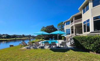 Unwind and relax at BELLA VISTA! This professionally decorated custom home is in a premiere location of Palmetto Dunes Resort. This home boasts breathtaking lagoon and golf views along one of the widest parts of the 11-mile lagoon system and 13th fairway of the Robert Trent Jones golf course. Bella Vista offers the privacy you long for on vacation, yet still only a short walk or bike ride to the beach and amenities of Palmetto Dunes.