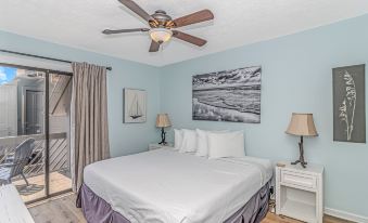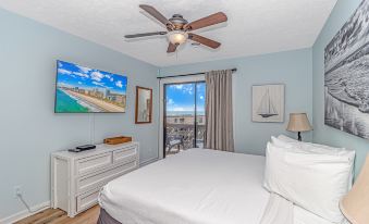 The master bedroom, tucked away off the living room, is a peaceful retreat. It features a king-sized bed, a large wall-mounted TV, a dresser for storage, nightstands, and direct access to the private balcony overlooking the ocean. The ensuite bathroom, which provides a tub/shower combo, vanity, and toilet, offers plenty of space and privacy for a relaxing escape.