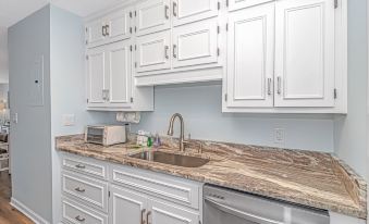 The kitchen, ideally located between the guest bedroom and the living room, comes fully equipped with full-size stainless steel appliances and plenty of counter and cabinet space to make cooking a joy. You'll love the gorgeous countertops, oversized kitchen sink, and coffee maker to jumpstart your mornings. The dishwasher ensures easy clean-up, and behind the bifold closet doors, you'll find a stackable washer and dryer, adding to the convenience of your stay.