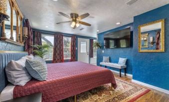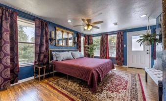 The guest room offers a king bed with a rustic charm, complete with a cheetah settee and wood accent wall for added style. A perfect retreat for guests to relax in comfort.