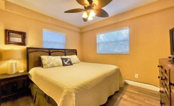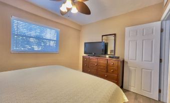 The master bedroom beckons with a plush new king-size bed, dresser, and TV, while the second bedroom offers a comfy full-size bed and armoire. The third bedroom, with two twin beds and a dresser, shares access to the second full bath. Dual AC units keep the entire space cool and refreshing, and a handy guest closet keeps everything tidy.