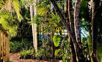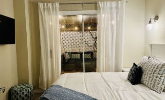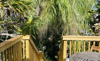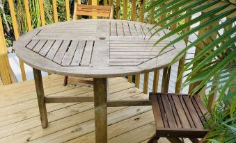 Upon entering downstairs from a subtropical brick path, there is a queen bed, bedside tables, dresser, armoire, armchair, and desk. The bedroom enjoys its own full bathroom, newly restored with eco friendly bathroom fixtures. Sliding glass doors give on to a private patio, its pergola covered in flowering vines.