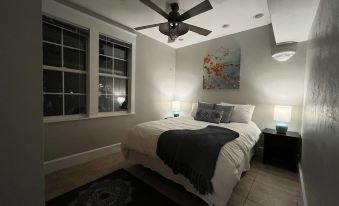The apartment connects to the main cottage along a tree-covered side alley. In the bedroom, there is a queen bed, two bedside tables with lamps, and a full closet with lots of clothes storage.