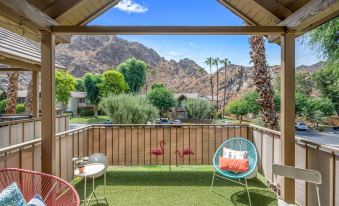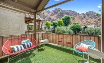 Enjoy your desert retreat in this renovated, upstairs second-story condo in the Mountain Cove community with 1 studio plus 1 open loft, and 1 bathroom. The gated community offers 2 year-round heated pools and EV chargers! You’ll have a private balcony with stunning mountain views out of the sliding glass doors, a fully stocked kitchen, and a desk for working remote.