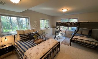 The downstairs basement is a game players delight, ping-pong, shuffle board, PS5, Xbox, that walks out to hot tub. Bedroom 5 is in the basement, sleeps 6.