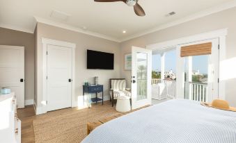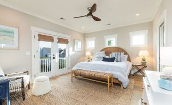Master Bedroom - King size bed with double vanity, oversized walk-in shower featuring rain shower head and sprayer. Custom designed closet by Charleston Closet with ample drawer space. Master bedroom also opens out to fully decorated second floor deck with ocean and pool views and easy access to to the rooftop. Features a one cup coffee machine for enjoying a cup of coffee while watching the sunrise from the rooftop.