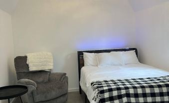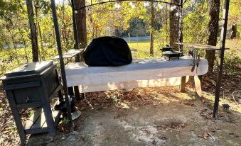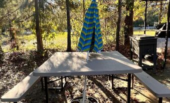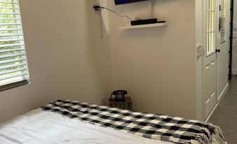 Blootooth fan, galvanized metal shower and handmade magnolia wood counter. Full bed in the loft for 2 extra guests. Play checkers, scrabble or just relax and watch 50" TV.
