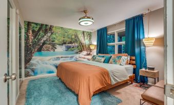 The bedrooms are both themed. The Master Bedroom appreciates nature with a California King Bed next to a huge waterfall Mural. The second guest room features a 3D Fantasy Moon sleep Experience w/ Cloud light and LED Lighted Queen Bed. Both w/Egyptian cotton sheets. We have 2 Futons with padding and bedding in closets.