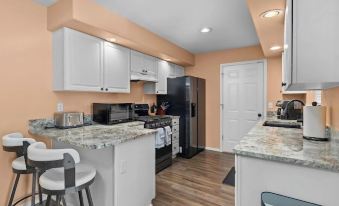 Modern, comfy, and relaxing—this duplex features a king master suite with vaulted ceilings for a light, airy feel. You’ll also find a cozy queen bedroom, two full baths, and a fully equipped kitchen.