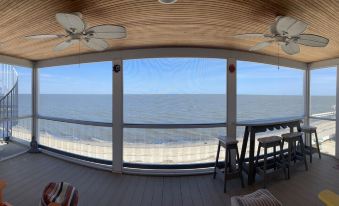 The huge windows on each side of the living and dining rooms give a panoramic view of the beach and water. It's awesome!
