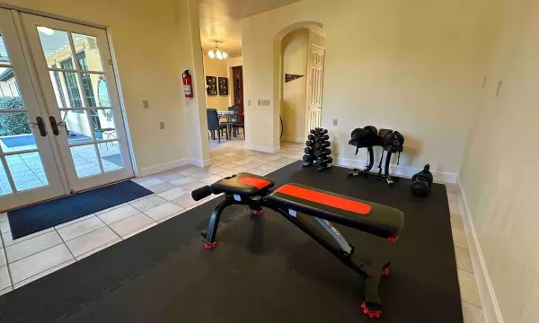 • Private gym: Maintain your wellness routine in our thoughtfully equipped gym, featuring hand weights, yoga mats, an exercise bike, free weights, a bench, and kettlebells.