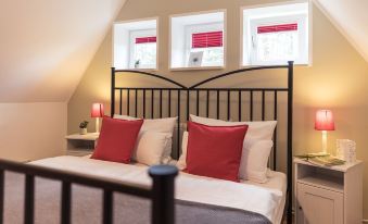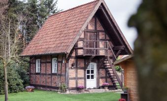 The charming 48 sqm half-timbered store was lovingly built and furnished for up to 4 people. On the ground floor there is a living room with a sofa bed for 2 people and a fully equipped kitchen with a ceramic hob with oven, a dishwasher and a dining area. On the top floor there is a small shower room and a romantic bedroom with a double bed. The little house has been warmly and charmingly furnished. It invites you to relax and unwind and offers extras such as TV, radio, DVD player and a free internet connection.