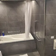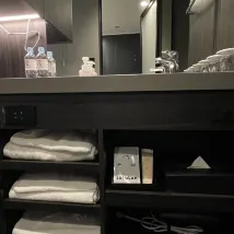 Nhà vệ sinh, phòng tắm và bồn rửa được tách biệt giống như nhiều khách sạn khác. Có một tấm rèm cuốn bên ngoài phòng tắm, có thể kéo xuống để biến thành phòng thay đồ hoặc để chặn không khí lạnh. Rèm cuốn không chiếm không gian mà vẫn có chức năng hữu ích.