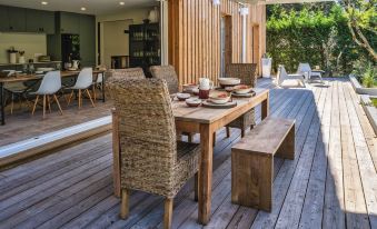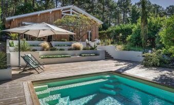 The living rooms open onto a large outdoor landscaped terrace all in wood of more than 150m2, equipped with garden furniture, built-in benches in espaliers, cushions, and armchairs; the opportunity to meet up in the evening around a good barbecue brazier, after a day spent at the beach or surfing the waves of Lacanau. An outdoor kitchen completes the terrace and will allow you to make the most of the Canaulais lifestyle.
