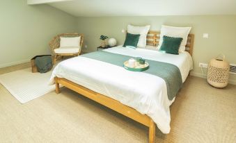 An office space on the landing with an IMac computer connected to the Internet network, printer, storage, will facilitate your teleworking needs (and isolation from the rest of the house) during your stay. The landing will offer you working comfort by bringing in natural light through the French window opening onto a small wooden balcony with garden armchairs where you can relax or find a space conducive to reading and meditation.