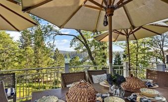 Once inside this LUXURY LAKE FRONT property you immediately feel the warmth & character of the historic home while also appreciating its newly remodeled & updated features. Relax in the Restoration Hardware furniture as you enjoy the wonderful lake views from nearly every room in the house! Stunning MAIN-LEVEL MASTER SUITE with easy access to kitchen & living areas. All main-level living & dining spaces open onto a large furnished lake view deck w/gas grill. Den & bar area will accommodate everyone for MOVIE NIGHT ON THE 85” SMART TV (6 MORE SMART TV’S THROUGHT). The professional kitchen is meticulously remodeled with hand rubbed solid white oak cabinets, quartz & quartzite counters, 2 dishwashers, 2 microwaves, 2 coffee makers, double oven range & built-in ceramic interior fridge w/solid bronze hardware. The walk-in pantry includes an additional “overflow” fridge for large groups. The living room features a massive fireplace & vaulted beamed ceiling with huge windows opening the house to the lake, trees & mountains. TWO ADDITIONAL MASTER SUITES perched at both ends of the top floor each have their own private staircases & balconies with “treehouse like” lake views. The house features organic cotton mattresses (including 4 Cal Kings) & ultra-high end custom Pom Pom bedding throughout. (2 cribs and 1 pack & play are available as well.) Four more fireplaces add charm & warmth. Downstairs are 3 more en-suite bedrooms & a game room that opens to a covered patio & spa. This beautifully landscaped property with serene waterfall & pond offers easy access from the OVERSIZED PARKING AREA with VERY FEW STAIRS INTO THE HOUSE!About pets:No pets allowed.NO pets allowed.About checkOut:Check out before 10:00 AM.About children:Children allowed: ages 0-17.About customRules:Observe Mountain Noise Ordinance by keeping noise levels down (especially when outside) between the hours of 10:00PM - 8:00AM..Observe Light Ordinance and turn off all exterior lighting by 10:00PM.,Always put trash bags in trash cans (no un-bagged trash please) & secure lids with rubber straps to keep wildlife out! NEVER LEAVE TRASH BAGS OUTSIDE!.About checkIn:Check in after 4:00 PM.About smoking:Smoking is not permitted.About minBookingAge:Minimum age to rent: 35.About events:No events allowed.