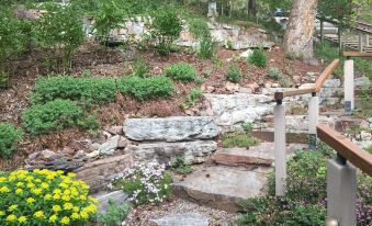 The property is multi-level, so you have great views of the lake through the trees from the house deck, and a completely different view of the lake when on the lower deck. There are stone steps leading down to the house from the garage/guest house as well as stone steps leading down to the lake. The last part of your drive to get to the house is a one lane dirt road with pull outs if you come across a car going the other way and our driveway is downhill once you go through the gate.