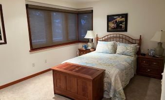 4 bedrooms (1 upstairs, master bedroom on main floor and 2 downstairs). The master bedroom has a master bath with heated floors, two shower heads in the shower and jetted tub. The upstairs bedroom has a twin bed and a 1/2 bath. The downstairs has a queen bedroom with attached bathroom with a tub/shower as well as a king bedroom with an attached bath with a steam shower. There is also a guest house above the garage with 2 queen beds, a kitchenette and full bathroom.