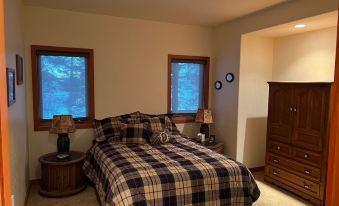 Overall we had a wonderful time and would return! The cabin is very secluded with a couple miles on gravel/dirt roads. The deck, dock, diving board, and direct access to the lake were all great! There are quite a few stairs to get down to the lake so it would be difficult for elderly people or anyone who has trouble with stairs. It’s also quite a trek back and forth if you need to use the bathroom or grab something from the cabin that you forgot. Inside the cabin was very clean, roomy, & comfortable, the furniture was all pretty outdated and “lived in”. It’s a charming home that made me feel like I was staying in my grandmas beloved lake house vs a sterile rental. We really enjoyed the large open kitchen and playing games on the big table. Besides enjoying the lake, I also loved reading on the upper deck first thing in the morning.