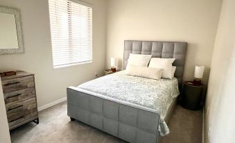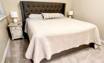 Accommodations include a master bedroom with a king bed, flat-screen TV, large walk-in closet, ceiling fan and on-suite bathroom; plus a guest bedroom with a queen bed, ceiling fan and a full bath next door.