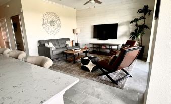 The living room features a large couch, leather chairs, ceiling fan, a large 65" TV and a Bose sound bar for linking to your bluetooth.
