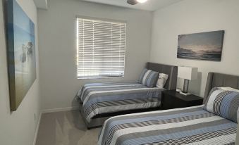 The master suite has a king size bed, dresser, walk-in closet, and master bathroom with walk-in shower enclosed by modern glass shower doors. The guest bedroom offers 2 twin size beds to accommodate additional visitors and a spacious closet.