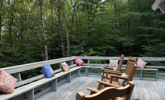 As you drive up the long windy driveway, you feel enveloped by the forest. When you near the top of the hill, the forest opens up to a contemporary mountain home. As you walk into the house thru the mud room, the Great Room opens before you with a soaring, 25ft peaked ceiling, sunlight streaming in thru windows, skylights and sliders everywhere, and the rich smell of yellow pine. The entire house is walled with tongue-in-groove yellow pine, with giant wood beams that run the length of the house and equally large cross beams and exposed joists, making a lattice of wood from floor to ceiling. Comfortably furnished and well appointed with all the comforts of home, you have multiple ways and places to relax. You can flop down on the giant sectional and put your feet up, go upstairs to the balcony and stretch out with a book or a game, go down to the lower level lounge and watch a movie on the 65” Samsung TV, retreat to your bedroom and take a nap curled up with feather and down pillows, or sit on the deck and bird watch at one of the feeders.