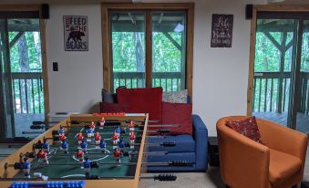 - Game room with a warm fire place, 4 club chairs, Love Seat, Pool Table, Dart Board, Poker table top and Foosball table.