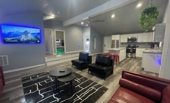 A modern, open concept space will provide comfort and ease for your Louisville stay! This 2 bedroom, 1 bath apartment features a spacious living room with ample seating, a 65" Smart TV and 2 sleeper conversion chairs that sleep 2 extra people. There's a full kitchen, stocked bathroom, desk & washer/dryer for your convenience! Enjoy plenty of natural light equipped with room darkening shades for privacy. Conveniently located minutes from Downtown, Churchill Downs and the Highlands! This is a 2nd floor apartment located behind the main house and Accessed through backyard. The back yard is a shard space so you may encounter guests of the main house while outside. Absolutely NO PARTIES!!! There is video surveillance on the outside of the property- parties will be shut down immediately!! About pets:Pets allowed: less than 50 lbs per pet (limit 2 pets total).About checkOut:Check out before 10:00 AM.About children:Children allowed: ages 0-17.About customRules:No local guests! NO SMOKING!! NO GATHERINGS OF ANY KIND! Only # of people of reservation permitted on property. Parties/gatherings not tolerated.About checkIn:Check in after 4:00 PM.About smoking:Smoking is not permitted.About minBookingAge:Minimum age to rent: 21.About events:No events allowed.