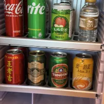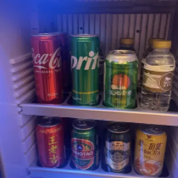 Mini bar có hai lon bia, vài lon nước ngọt và vài chai nước