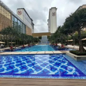 Bắt xe buýt xuyên biên giới thẳng từ Hồng Kông đến bãi đậu xe của khách sạn. Sẽ có biểu diễn bay của động vật biển tại quảng trường của sảnh khách sạn vào mỗi 13, 15, 17 và 19 giờ. Nhận phòng tại quầy lễ tân mất khá nhiều thời gian. Không gian phòng tương đối rộng. Khách sạn có tương đối ít tiện nghi dành cho trẻ em, không có nhà vệ sinh nhỏ, đồ vệ sinh cá nhân tốt. Trà sữa trong sòng bài rất ngon, ngày nào tôi cũng đi lấy.