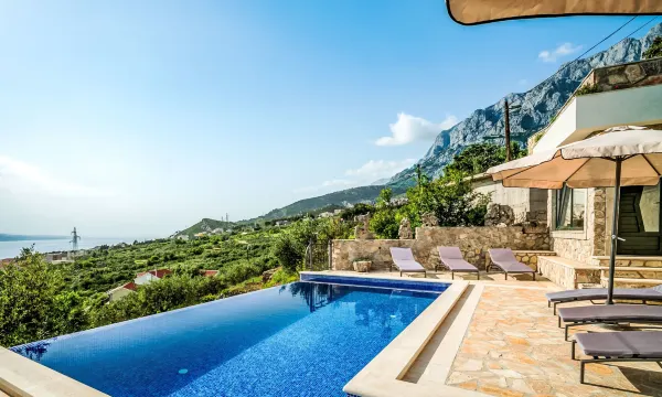 Single-family house "Bellavista", 2 storeys. Above Makarska, in the hamlet Puharići 1.5 km from the centre of Makarska, in a quiet, sunny position on a slope, 1.5 km from the sea, 1.5 km from the beach. Private: property 500 m2 (fenced), swimming pool angular, heated (8 x 3 m, depth 150 cm, seasonal availability: 01.Apr. - 31.Oct.) with internal staircase. Outdoor shower, terrace (140 m2), garden furniture, barbecue, pool maintenance by the owner/gardener. In the house: internet access, sauna (extra). Washing machine. Parking (for 2 cars) on the premises. Shop, restaurant 800 m, bus stop 3.6 km, pebble beach 1.5 km. Neighbourhood highly sensitive to noise. Quietness and good behaviour expected. Heating of the water in the swimming pool (extra). It is necessary to announce 7 days in advance if the pool heating is required. Sauna at small house next to the pool. 3-room house 100 m2 on 2 levels, south facing position. Living/dining room 35 m2 with 1 double sofabed (160 cm, length 200 cm), satellite TV (flat screen), air conditioning. Exit to the terrace, to the swimming pool. Open kitchen (oven, dishwasher, 4 ceramic glass hob hotplates, microwave, freezer). Bath/WC. Upper floor: 2 rooms, each room with 1 french bed (180 cm, length 200 cm), shower/WC and satellite TV (flat screen), air conditioning. Exit to the balcony. Electric heating. Balcony 12 m2, terrace 70 m2 partly roofed. Terrace furniture, barbecue, deck chairs. Marvellous panoramic view of the sea, the countryside and the resort. Facilities: Internet (WiFi, free).