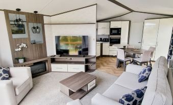 Our lodge features an open layout kitchen that comes equipped with an integrated fridge freezer, dishwasher, microwave, and gas oven grill. Enjoy home-cooked meals at the dining table that comfortably sits 4 people.