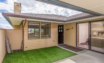 - Bedroom with King Bed, TV and access to private patio and lawn area