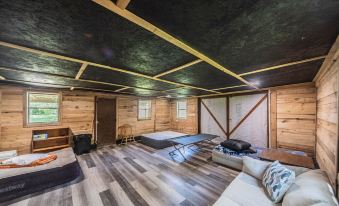 Outdoor Cabin- extra space for the kids to gather; heated and cooled; air mattresses with a couch; no bathroom- this cabin is only available with a minimum 4 night stay.