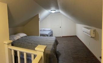 The house has a queen bedroom downstairs, and a queen and full up in the loft. Cabin next to the house has a queen and full bed.