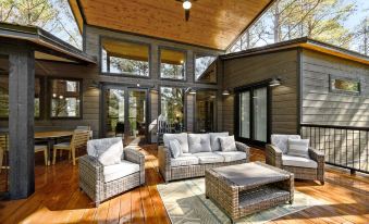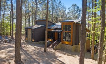 This spacious 1540 square foot cabin has a warm, contemporary interior and is nestled in 1.5 acres of peaceful woods. The open concept living space has ample views of beautiful Oklahoma Pines. The cabin sleeps up to 9, with two master bedrooms, each with a king bed, tv, and en suite bathroom. One bedroom also includes 2 additional lofted twin beds with ladder access. Triple twin bunks are tucked between the master bedrooms and sit next to a half bath. Adults and children will enjoy the seated arcade console full of classic games like Pac Man, Dig Dug, and Donkey Kong. A well appointed indoor kitchen with double ovens stands ready for your group’s use and enjoyment.
